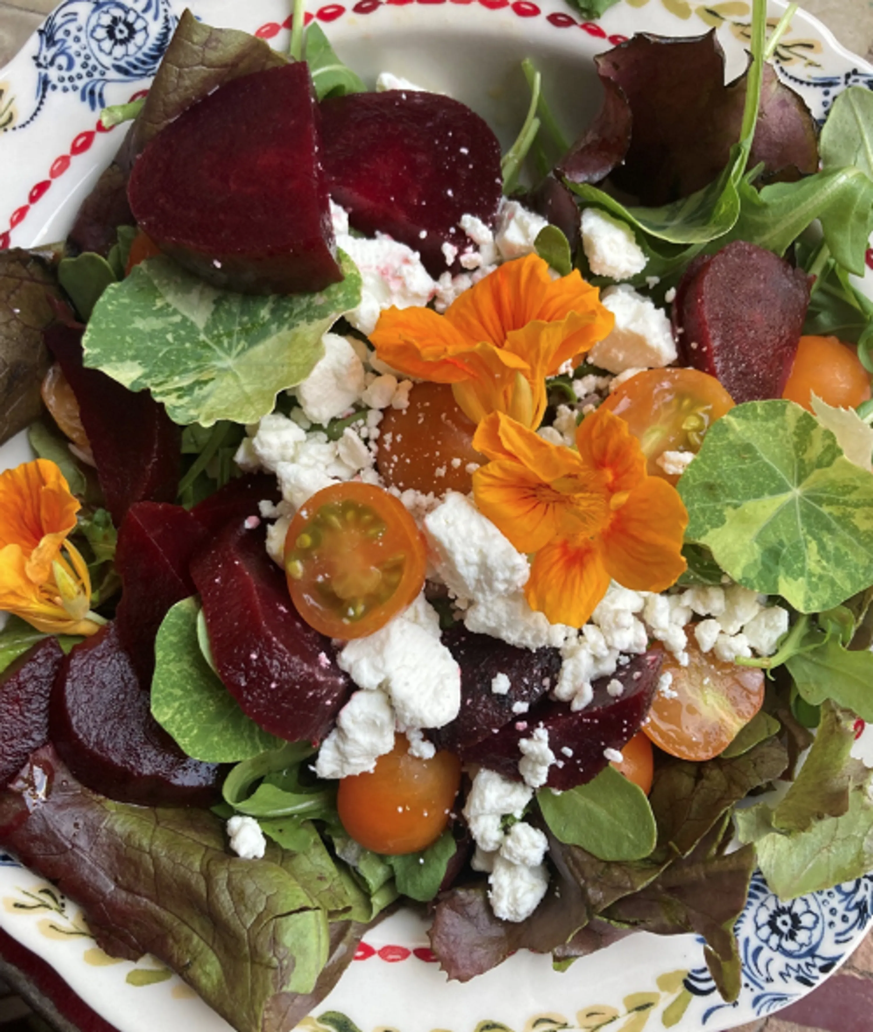 A favorite of painters and staff member Chanelle Russ alike, nasturtiums flower in a variety of warm colors. Often used as companion plants in veggie beds, they attract pollinators and, in vining form, send their rounded leaves tumbling over edges or creeping up supports.